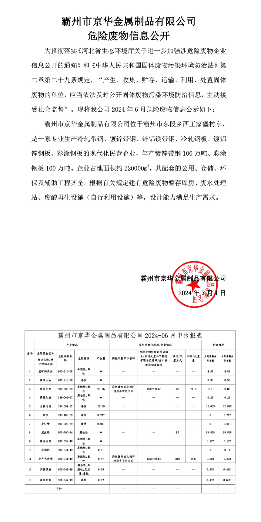 24年6月危險廢物信息公開-霸州市京華金屬制品有限公司