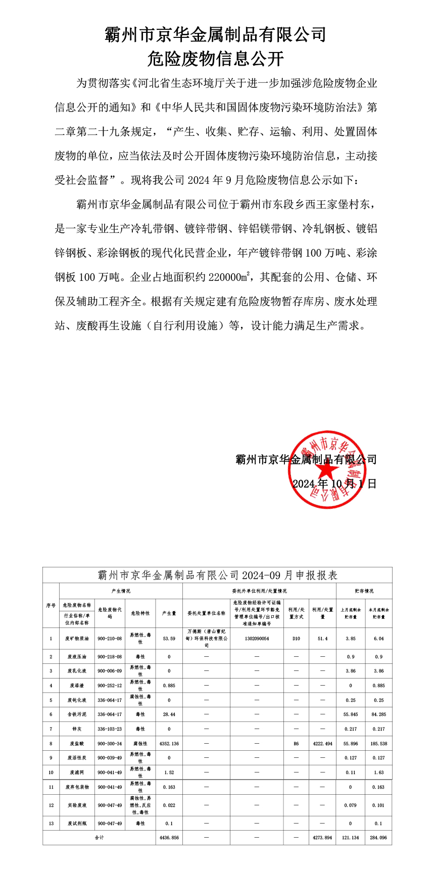 下一條:24年10月危險廢物信息公開-霸州市京華金屬制品有限公司